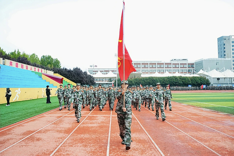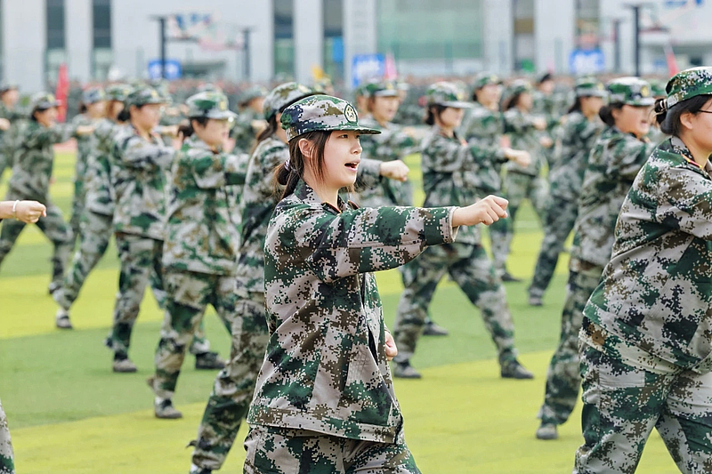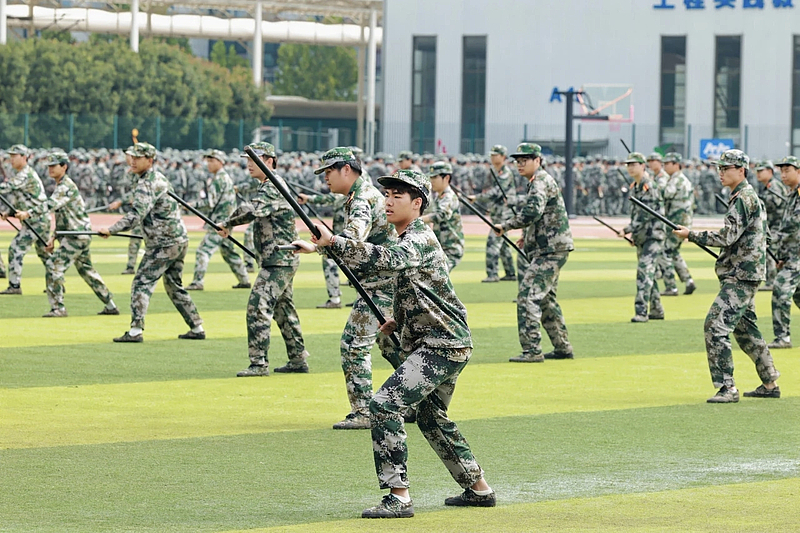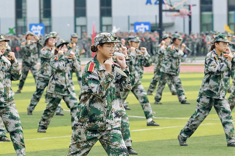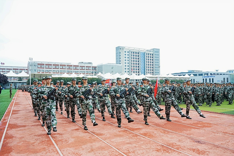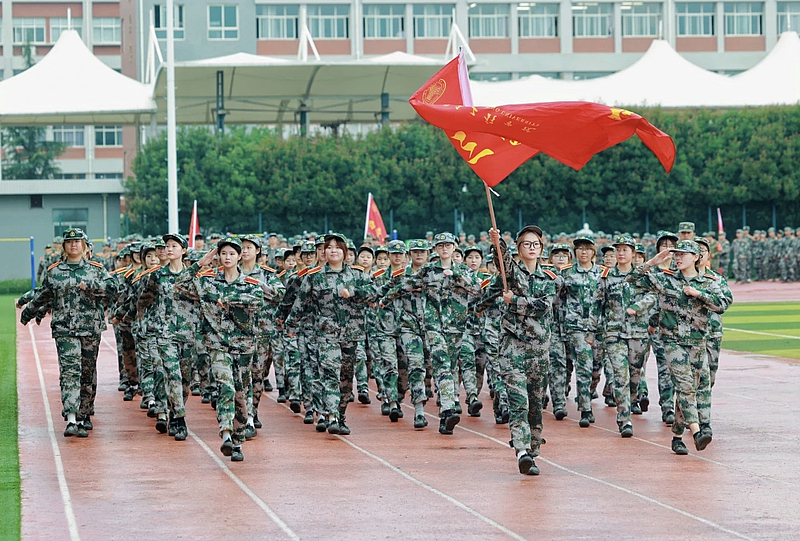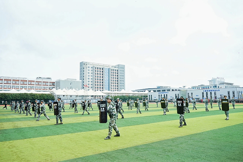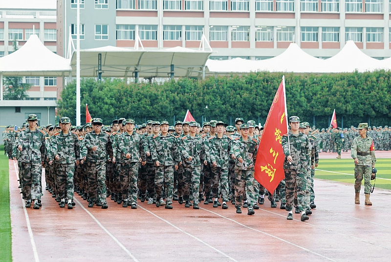 上午九时许,庄严的国歌声中,典礼正式拉开帷幕。同学们目光坚定、步伐铿锵、口号响亮,以饱满的精神和整齐的队列依次经过主席台,接受检阅。分列式上,军体拳方队、棍术方队、花样方队、女子匕首操方队等训练项目熟练有力,用高昂的斗志和振奋人心的口号,全面展示了十四天军训的丰硕成果,彰显出2025级新生昂扬的精神面貌和顽强的意志品质。