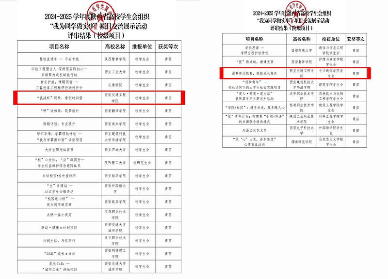近日,团省委、省学联开展的陕西省高校学生会组织“我为同学做实事”项目评选结果揭晓,开云kaiyun官方网站校学生会申报的项目《“挑战杯”逐梦:青创特训营》与通信与人工智能学院学生会申报的项目《深耕劳动教育,赋能成长底色》同步入选,获评青苗等次,这充分展现出开云校、院两级学生会聚焦同学成长需求、扎实开展服务工作的突出成效与良好风采。