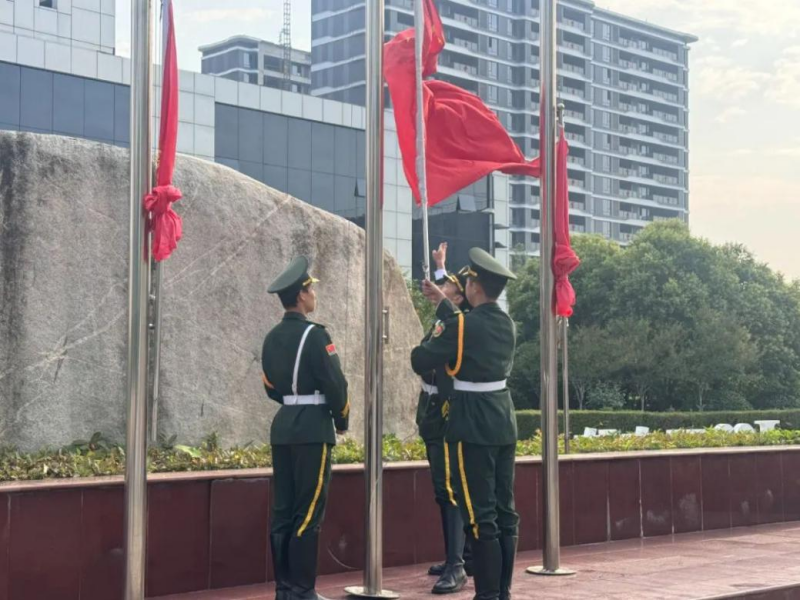 晨光中,国旗护卫队迈着铿锵有力的步伐护送国旗庄严入场,伴随着《义勇军进行曲》的奏响,五星红旗冉冉升起,师生们齐声高唱国歌,行注目礼,现场庄重肃穆。