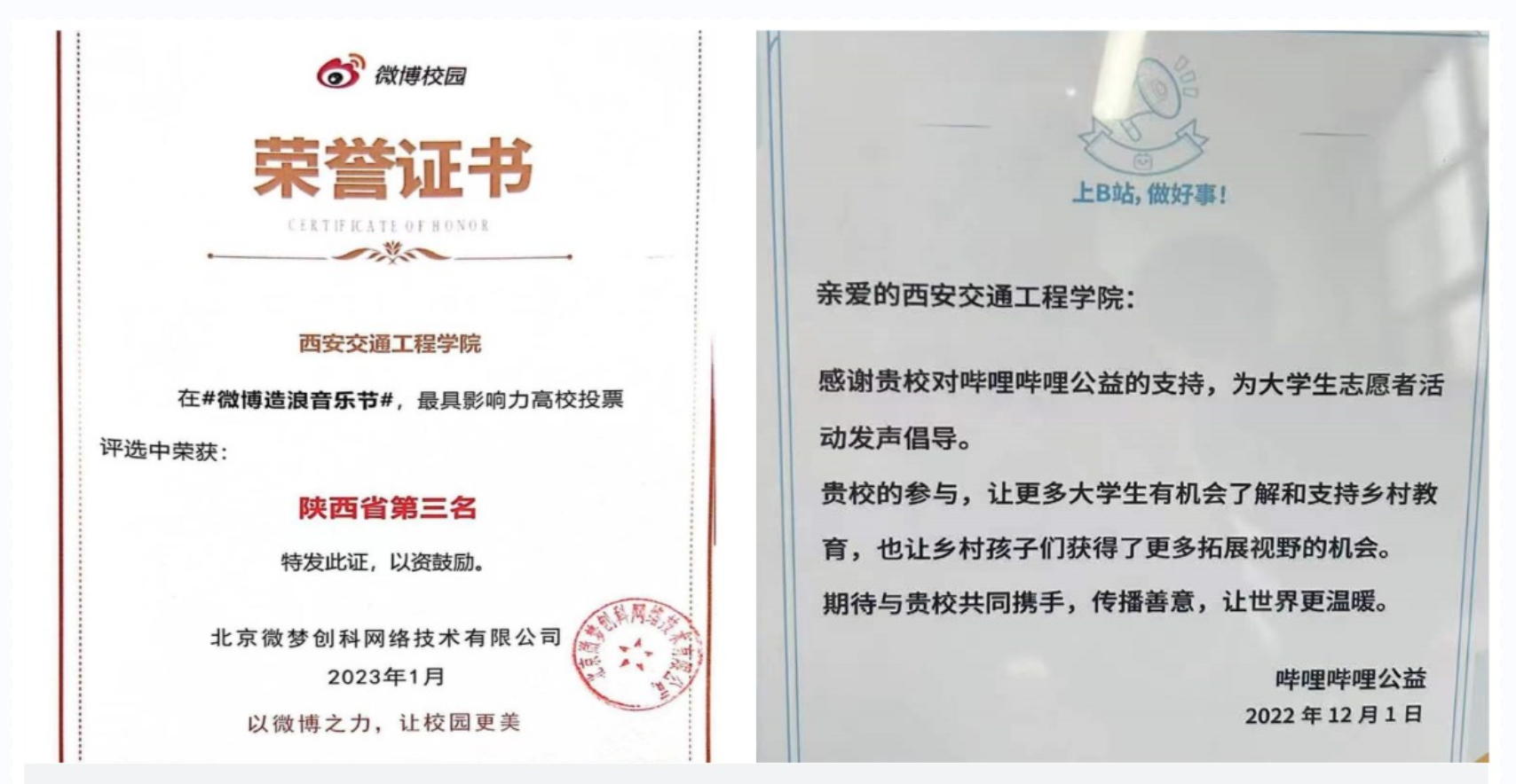 近日,学校在新浪微博举办的“#微博造浪音乐节”最具影响力高校投票评选中荣获“陕西省第三名”;哔哩哔哩运营团队近日也收到了哔哩哔哩公益发来的感谢信,感谢学校在参与大学生志愿活动中积极发声倡导,让更多大学生有机会了解和参与乡村教育,也让乡村孩子们获得了更多拓展视野的机会。