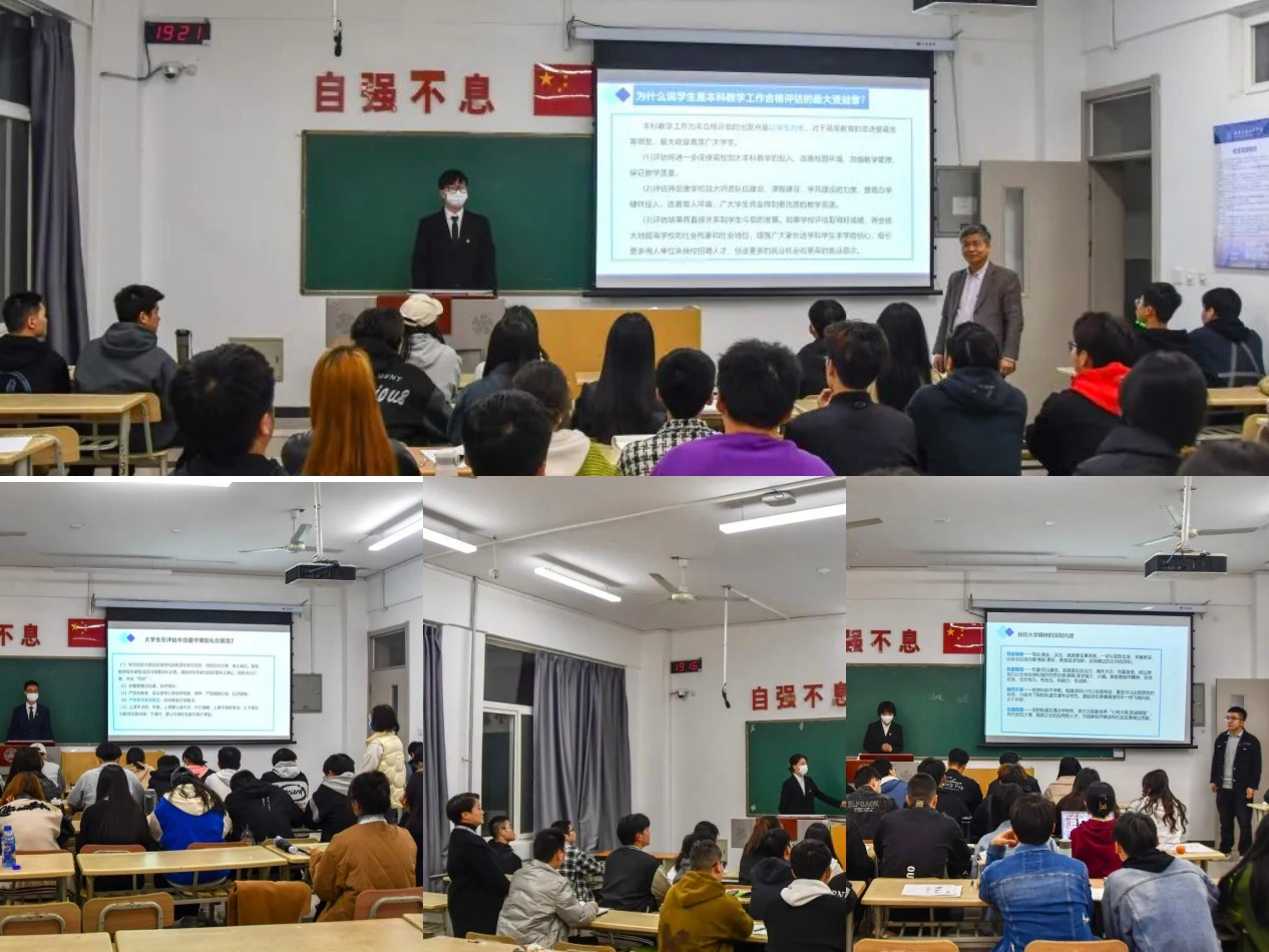 ——宣讲走深走实,互动入脑入心。该院利用晚自习时间组织各班开展宣讲活动,该院院长崔炳谋、党委书记胡省利、副书记张雯雯及各班辅导员逐班进行走访,深入了解同学们对于评估知识的学习和掌握情况,并进行了互动提问。该院领导对同学们认真听讲的状态以及同学们“以校为荣,戮力同心迎评估”的爱校精神予以高度赞扬,并对此次活动的有效开展也给予了充分肯定。