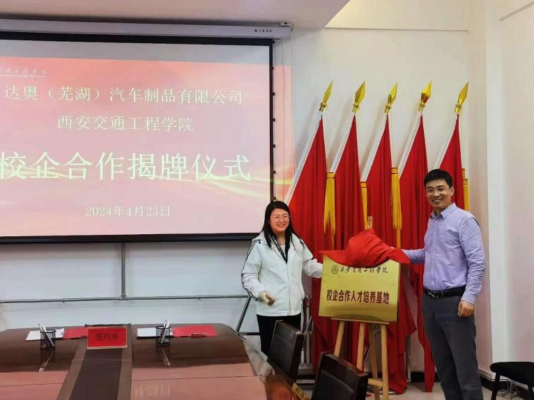 达奥(芜湖)汽车制品有限公司王工表示,校企合作是新形势下企业发展进步的内在要求和实现双赢的战略举措,期望通过本次校企合作,可以充分发挥各自的优势,实现校企资源的有机结合和优化配置,促进产学研深度融合,携手开创共赢发展新局面。随后双方代表签署了战略合作协议并为“就业实习实训基地”揭牌。