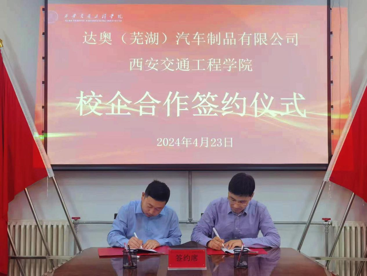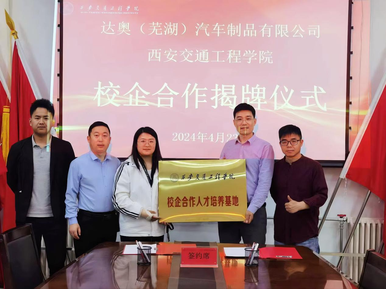为了充分发挥企业在创新教育中的作用,推动科教融汇、产教融合,加强人才实践创新能力培养,校企携手构建共建共享共赢的合作关系,拓宽就业渠道,4月23日,开云kaiyun官方网站与达奥(芜湖)汽车制品有限公司校企合作签约仪式和揭牌仪式在6—212进行,达奥(芜湖)汽车制品有限公司总监陈志传、达奥(芜湖)汽车制品有限公司校招负责人喻英和现代技术学院院长都娟丽、副院长党亮亮,学工秘书贺毅出席此次会议。
