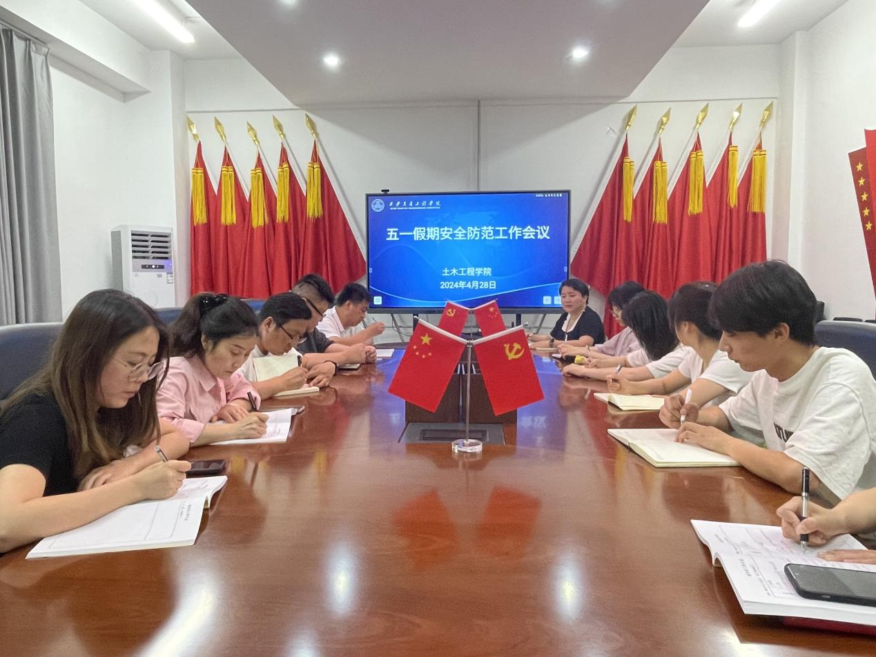 ——召开“五一”假期安全防范工作会议。4月28日晚上,土木工程学院在崇文楼3-212会议室组织全体辅导员召开“五一”假期安全防范工作会议,会议由该院党委副书记兼副院长张雯雯主持。
