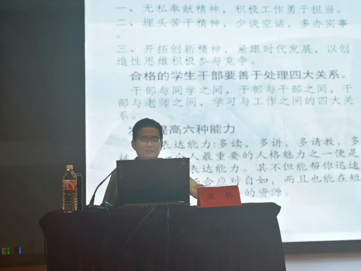 庞桥教授结合具体案例,深入剖析学生干部在工作中可能遇到的各种问题和挑战,通过分享自己的工作经验和心得体会,向学生干部传授了需要培养的三种精神、合格学生干部要善于处理四大关系、发展提高六种能力,并鼓励学生干部要注重团队合作,发挥集体智慧,共同推动工作的开展。