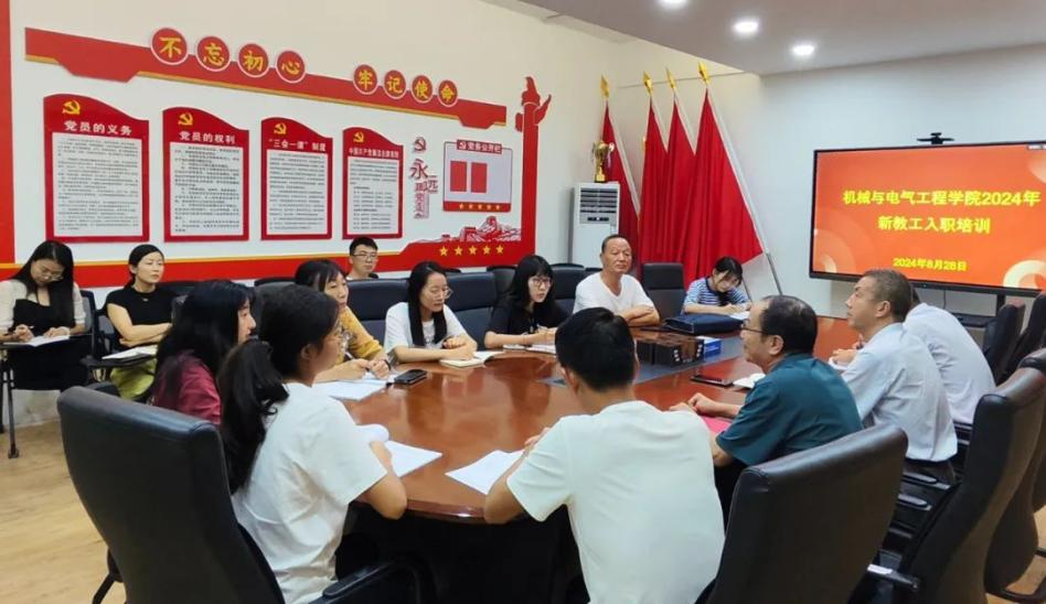 经纶传后世,教诲润心田。为全面提升新入职青年教师综合素质,加强学校教师队伍建设,使青年教师培养工作更加规范化,8月28日,机械与电气工程学院召开2024年新教工入职培训会议。院长丁旺才、党委书记王拓辉、副院长任小文及十三位新入职教师参加本次培训会议。