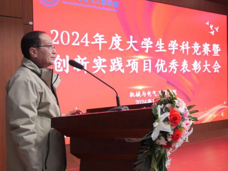 会上,丁旺才宣读了《2024年度学科竞赛暨大学生创新实践表彰文件》。对在第十八届全国大学生智能汽车竞赛、第九届全国应用型人才综合技能竞赛、全国首届新能源制氢储氢及发电技术竞赛等国家级赛事中获奖的学生团队、优秀学生、优秀指导教师给予了高度认可并颁发荣誉;吴伟副校长、石广田副校长等与会领导依次为获奖学生和优秀指导教师进行了颁奖。机械与电气工程学院党委书记王拓辉做了2025年大学生学科竞赛暨创新实践活动做了动员,希望广大师生能够继续发扬拼搏进取的精神,积极参与各类竞赛和实践活动,共同携手开创学院发展的新篇章。颁奖结束后,获奖学生代表赵振江同学进行了分享发言。他结合自己的参赛经历和成长中的心得体会,鼓励在场同学珍惜参与竞赛的宝贵机会,勇于挑战自我,在实践中持续精进创新能力与实践技能。
