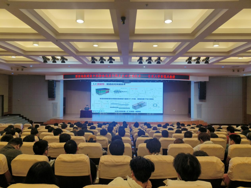 黄强兵教授结合自身丰富的科研经验,深入浅出地讲解了西安地铁建设过程中遇到的地面沉降、地裂缝、活动断裂带、饱和水砂层、饱和软黄土等五大类地质问题,并通过详实的工程案例、灾变机制研究和应对措施,为在场师生呈现了一场精彩纷呈的学术报告。他指出,针对这些复杂的地质问题,研究团队主要采用现场监测、模型试验和数值模拟等方法,取得了丰硕的研究成果,并成功应用于地铁建设实践中,有效加快了工程进度,节约了建设成本。