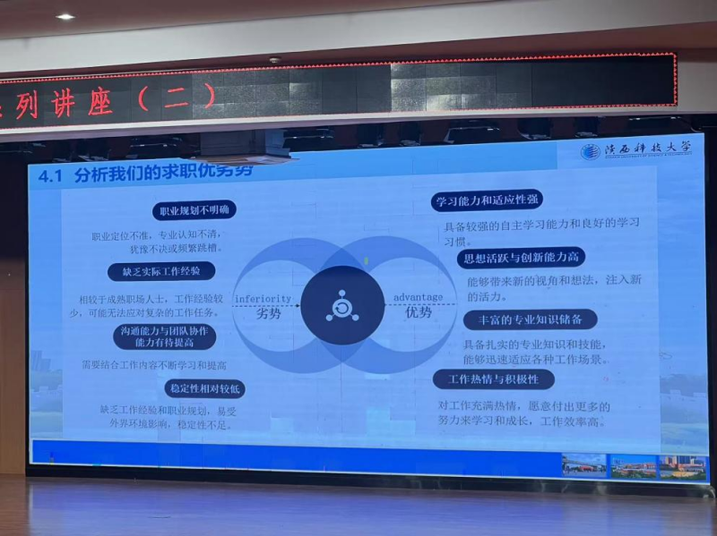 在就业形势分析环节,张老师借助详实数据、典型案例,剖析当下经济环境与行业趋势,帮助学生全面认识就业形势。随后,在就业路径选择环节,张老师介绍各地人才政策,阐述“先就业,再择业”的合理性,并结合不同专业特点,介绍传统就业、新兴业态、自主创业等多元化路径,鼓励学生发挥优势,把握就业机会 ,找到适配发展方向。