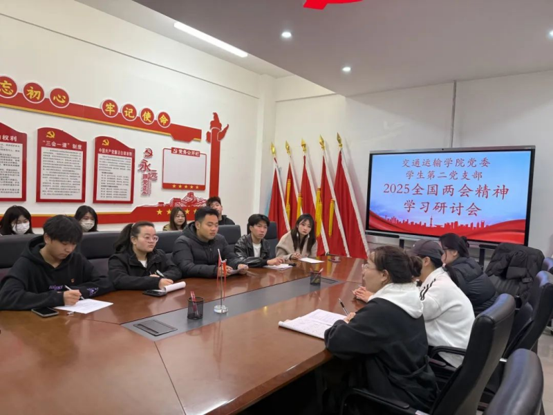 交通运输学院党委第二党支部在4-212党员活动室举行全国两会精神学习研讨主题党日活动。会议伊始,学生第二党支部书记李瑞霞围绕学习主题领学并讲话指出:这次全国两会是一次高举旗帜、凝心聚力、真抓实干、团结奋进的大会。坚持把习近平新时代中国特色社会主义思想融入教学科研与人才培养全流程,将学习成果转化为育人实践,创新交通人才培养模式,为交通事业输送优秀人才。