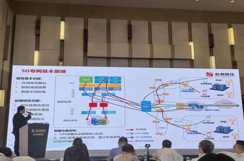 大会汇聚了来自轨道交通领域的百位嘉宾,围绕智慧轨道交通的多个关键议题展开深入探讨,分享最新研究成果与实践经验,为推动行业高质量发展注入新动力。5G技术的快速发展为轨道交通行业带来了新的机遇和挑战。徐寅翔在演讲中详细介绍了杭州地铁在5G公专网应用方面的探索与实践。