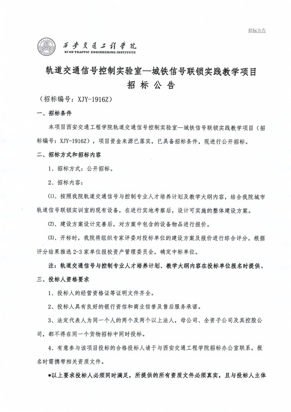 开云kaiyun官方网站轨道交通信号控制实验室—城铁信号联锁实践教学项目招标公告