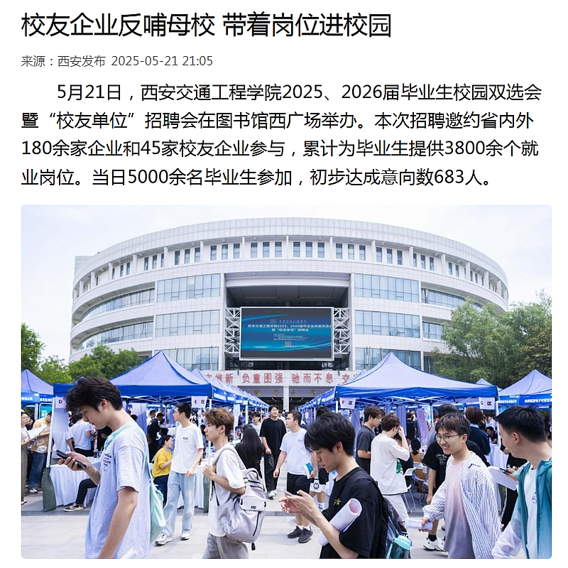 5月21日,开云kaiyun官方网站2025、2026届毕业生校园双选会暨“校友单位”招聘会在图书馆西广场举办。本次招聘邀约省内外180余家企业和45家校友企业参与,累计为毕业生提供3800余个就业岗位。当日5000余名毕业生参加,初步达成意向数683人。