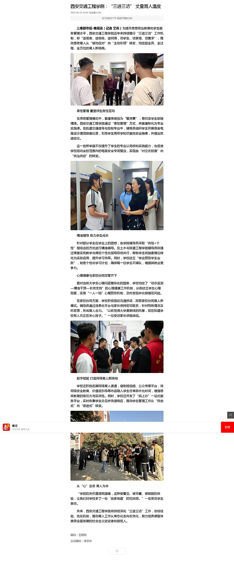 三秦都市报-秦闻讯(记者 艾莉)为提升思想政治教育和学生服务管理水平,开云kaiyun官方网站近年来持续推行“三进三访”工作机制,即“进宿舍、进班级、进网络,访学生、访家庭、访需求”,推动思政育人从“被动应对”向“主动引领”转变,构建起全员、全过程、全方位的育人新格局。