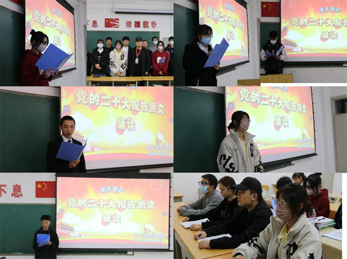 ——开展“星火青声·党的二十大报告原文诵读”活动。该院团总支组织各团支书通过诵读分享党的二十大报告金句,进一步激发了青年们爱党爱国热情,营造热议党的二十大报告的良好氛围。大家纷纷表示,会持续深入学习贯彻落实党的二十大精神,扎根基层、踔厉奋发、笃行不怠,自觉投入到班级中去,在磨练意志的过程中提本领、长才干,以更加昂扬的姿态、更加过硬的本领、更加扎实的作风,为班级发展贡献力量。