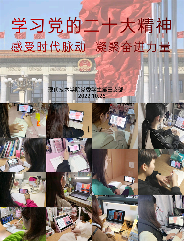 为进一步学习宣传贯彻党的二十大精神,加强青年学生理想信念教育,培育积极健康的学风,现代技术学院以研习会、专题党课、原文诵读“三驾马车”并行,加深全体学生理解,以点带面、加强示范,在学院营造起浓厚的学习氛围,推动学习宣传贯彻党的二十大精神,走深走实、见行见效。